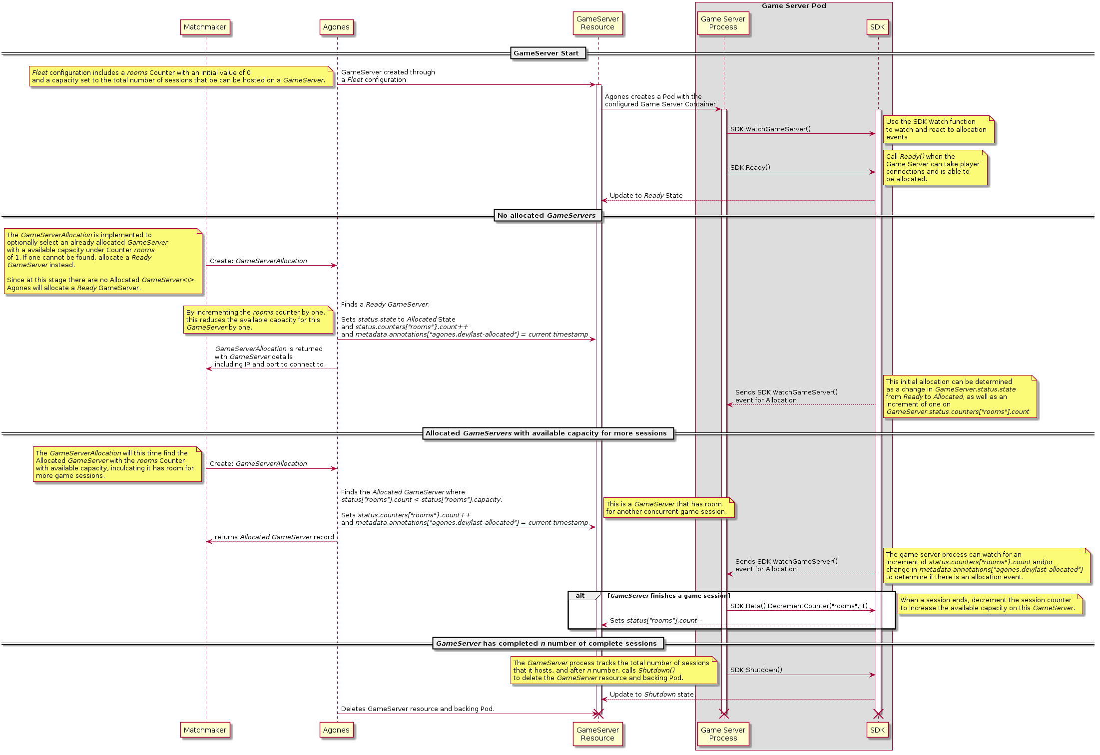 Utilising the allocation gameServerState filter as well as the new ability to add Counter capacity and counts to GameServer records at both allocation time, and from within the game server process, via the SDK, means Agones is able to atomically track how many sessions are available on a given a GameServer from the list of potentially Ready or Allocated GameServers when making an allocation request.